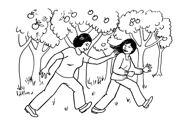 Once Joseph and Mary were serving in the city of Puebla. There are really good apples out there. And one day they went to a place where there were many apples. They picked up a lot to eat and sat down under the apple tree and began to eat the apples. And when they had finished eating, they began to talk and to chase each other, and then they went back to their seats. They were tired and lay down and slept for a long time.